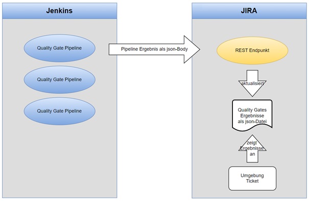Dank eines solchen Endpunkts konnten wir in Jira direkt die Ergebnisse unserer Quality Gates aus Jenkins empfangen. Jedes Mal, wenn in Jenkins eine Quality-Gate-Pipeline durchläuft, wird das Ergebnis als JSON an unseren Endpunkt gesendet. Dieser speichert die Daten in einer Datei auf dem Jira-Server, die alle Quality-Gate-Ergebnisse für sämtliche Umgebungen zusammenführt. Was mit diesen Daten dann geschehen wird, ist im nächsten Abschnitt beschrieben und auch schon auf der folgenden Abbildung erkennbar.